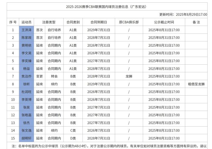 北京时间8月29日,CBA官网更新了内援注册名单,广东男篮在这次注册中注册了15名球员。