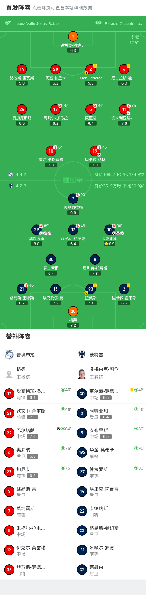 蒙特雷4-2逆转普埃布拉取墨超6连胜,卡纳莱斯帽子戏法,奥坎波斯2传1射