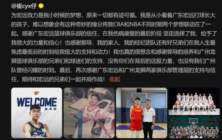 崔永熙今天也是非常开心地更新个人社媒账号,表达了对于加盟广东男篮的欣喜之情。崔永熙表示,为宏远效力是他小时候的梦想,原来一切都有迹可循。崔永熙还说,他是从小看着广东宏远打球长大的孩子,难以想象会有这种奇妙的缘分,将他CBA和NBA不同时期两个梦想联动在了一起。
