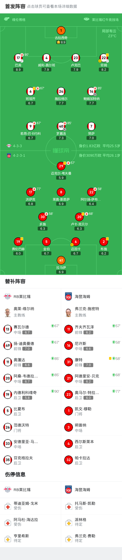 RB莱比锡2-0海登海姆,鲍姆加特纳建功,罗慕洛锁定胜局