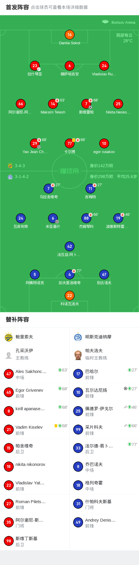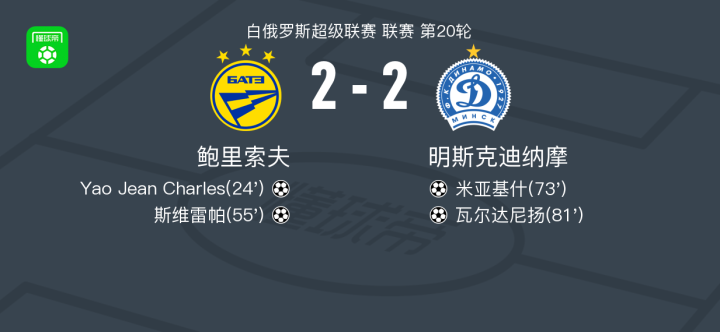 鲍里索夫2-2明斯克迪纳摩,Yao Jean Charles破僵,瓦尔达尼扬扳平比分