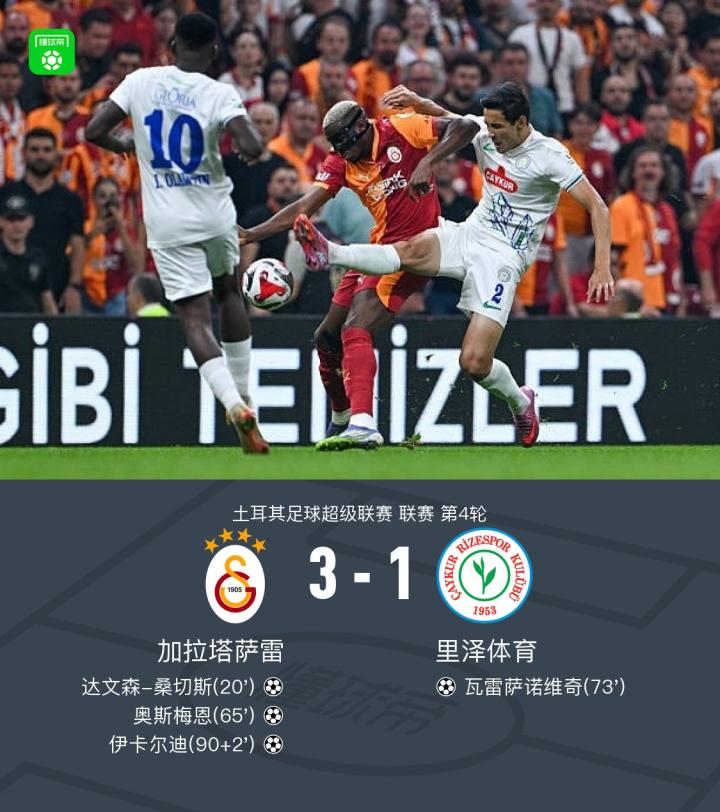 北京时间8月31日,土耳其足球超级联赛第4轮,加拉塔萨雷坐镇主场迎战里泽体育。 比赛第20分钟,加布里埃尔-萨拉送出助攻,达文森-桑切斯破门得分,为主队首开纪录。第65分钟,巴尔达克奇精准传球,奥斯梅恩推射入网,将比分扩大为2比0。第73分钟,里泽体育由瓦雷萨诺维奇抓住机会扳回一城,比分变为2比1。下半场补时阶段第2分钟,罗兰-绍洛伊送出关键助攻,伊卡尔迪冷静破门,为加拉塔萨雷锁定胜局。 最终,加拉塔萨雷以3比1战胜里泽体育,取得本场比赛的胜利。