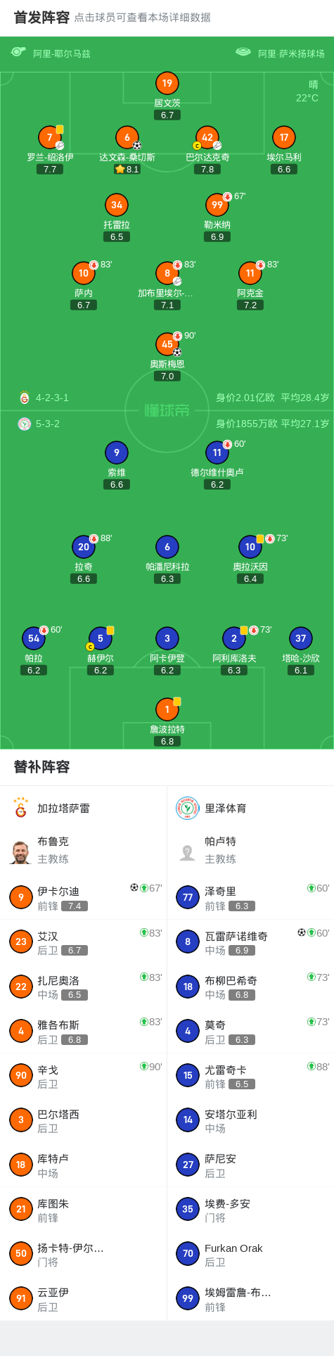 第20分钟,先拔头筹,达文森-桑切斯头球破门,加拉塔萨雷1-0