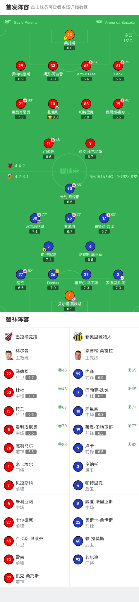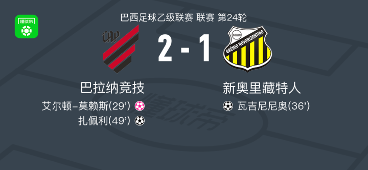 北京时间8月31日,巴西足球乙级联赛第24轮,巴拉纳竞技坐镇主场迎战新奥里藏特人。比赛开始后,新奥里藏特人球员艾尔顿-莫赖斯不慎自摆乌龙,为巴拉纳竞技先拔头筹。随后,罗德里戈-阿尔维斯送出助攻,瓦吉尼尼奥为新奥里藏特人扳平比分。下半场,扎佩利为巴拉纳竞技打入制胜球。最终,巴拉纳竞技以2比1战胜新奥里藏特人。