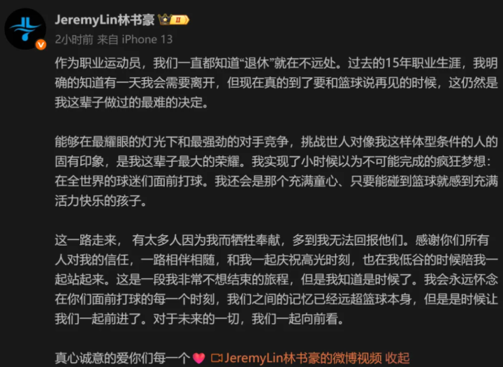 “作为职业运动员,我们一直都知道‘退休’就在不远处。过去的15年职业生涯,我明确的知道有一天我会需要离开,但现在真的到了要和篮球说再见的时候,折让然是我这辈子做过的最难的决定。”林书豪这么写道。再见了,林书豪,再见了,林疯狂!