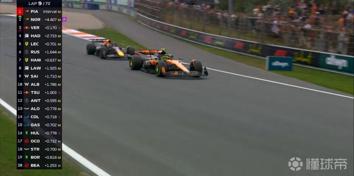 第9圈:诺里斯在1号弯保持在外线强硬完成超越,他与队友的差距目前为4.5秒;