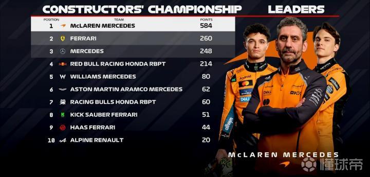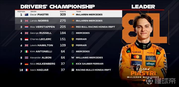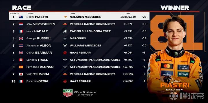 第1-第5:皮亚斯特里、维斯塔潘、哈贾尔、拉塞尔、阿尔本