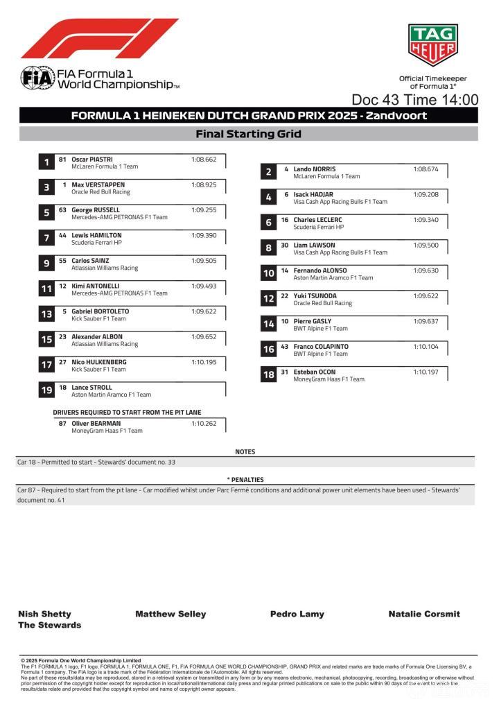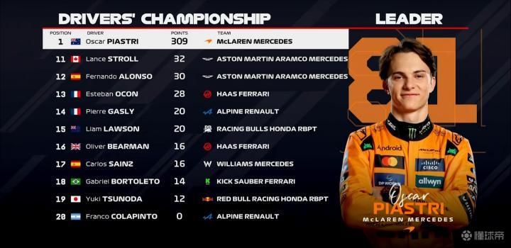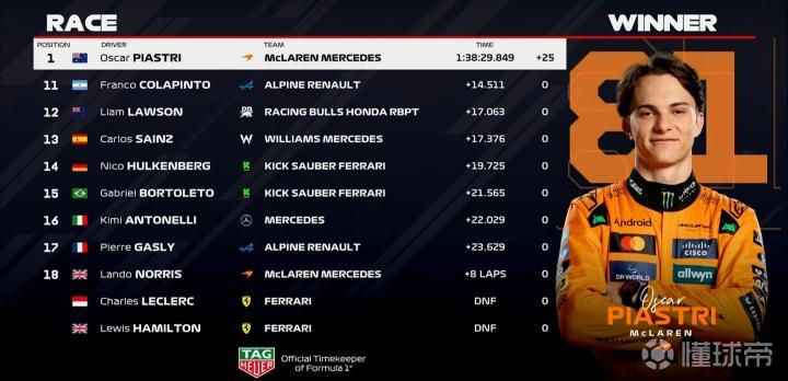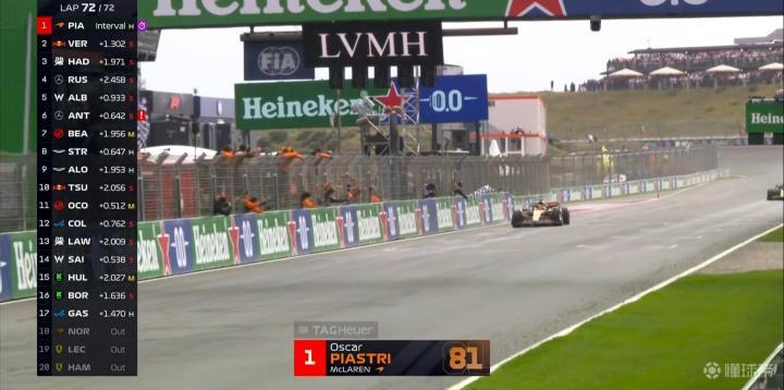 F1荷兰站正赛:皮亚斯特里夺冠,哈贾尔季军,法拉利&诺里斯退赛