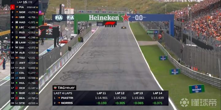第15圈:诺里斯保持追近的态势,勒克莱尔已经掉出哈贾尔的DRS区间;