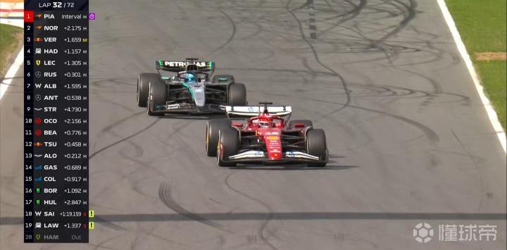 第32圈:勒克莱尔在11号弯开上砂石地强硬挤进内线,超越拉塞尔上升至第5!