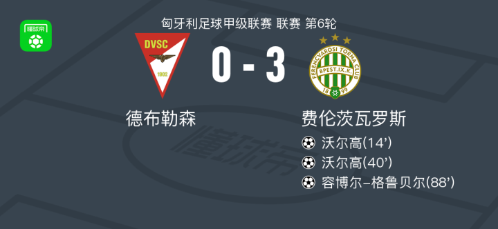 费伦茨瓦罗斯3-0大胜德布勒森,沃尔高两球,容博尔-格鲁贝尔破门