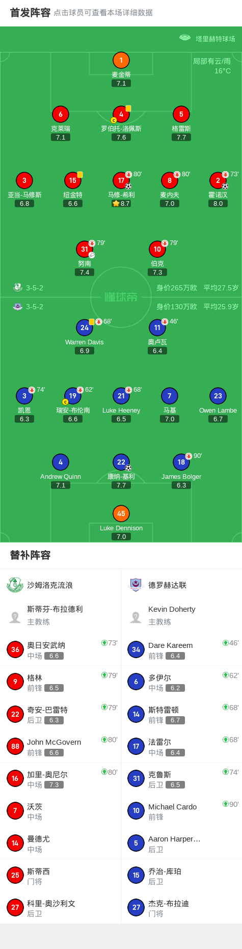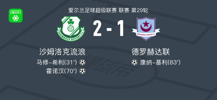第70分钟,沙姆洛克流浪球员努南助攻霍诺汉打入一球。