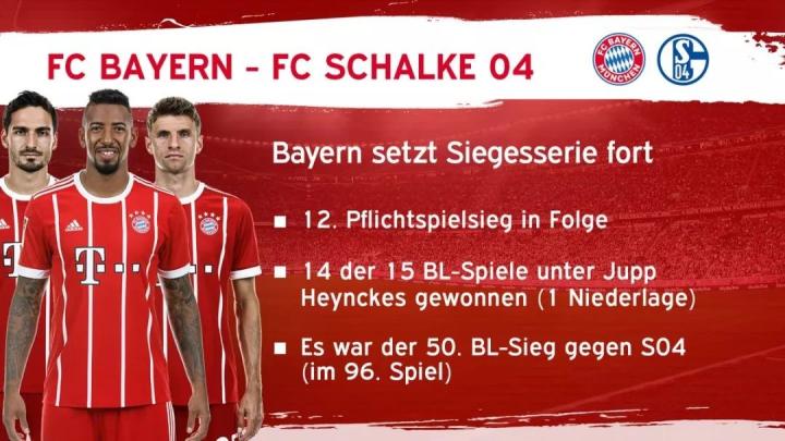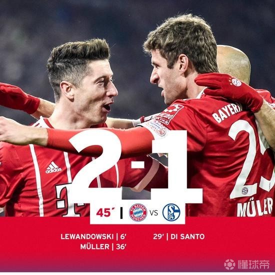 北京时间2月11日凌晨1:30,2017-2018赛季德甲第22轮继续开战,领头羊拜仁慕尼黑终于回到主场,应战挑战者沙尔克04。上半场,莱万、穆勒破门,迪桑托为客队进球,拜仁2-1暂时领先;下半场,两队均无建树,最终,拜仁2-1击败沙尔克,各项赛事取得了12连胜。22轮战罢,拜仁积分高达56分,继续以18分的优势领跑,沙尔克34分跌至积分榜第6位。莱万连续11个德甲主场破门,追平海因克斯连续11个主场进球的纪录。