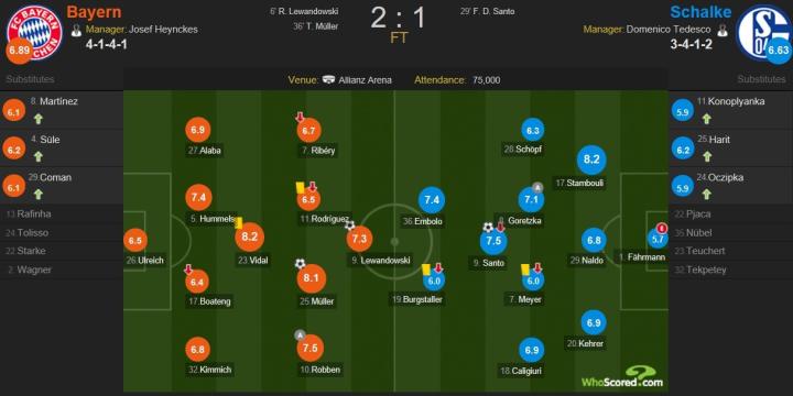 由于72岁的老帅海因克斯在赛前染上了流感,卧病在床,无缘应战老东家沙尔克,拜仁的本场比赛由65岁的助理教练彼得-赫尔曼在场边指挥。在首发阵容方面,拜仁并没有选择大幅轮换,与上一场比赛相比只有两个位置做了调整:博阿滕和里贝里顶替了聚勒和科曼。阵型方面,赫尔曼遵循了之前海因克斯的布置:门将是26号乌尔赖希,四后卫分别是5号胡梅尔斯、17号博阿滕、27号阿拉巴和32号基米希,23号比达尔拖后出任单后腰,身前是11号哈梅斯-罗德里格斯和25号穆勒,两翼则是10号罗本和7号里贝里的“罗贝里”组合,9号莱万多夫斯基出任单箭头。