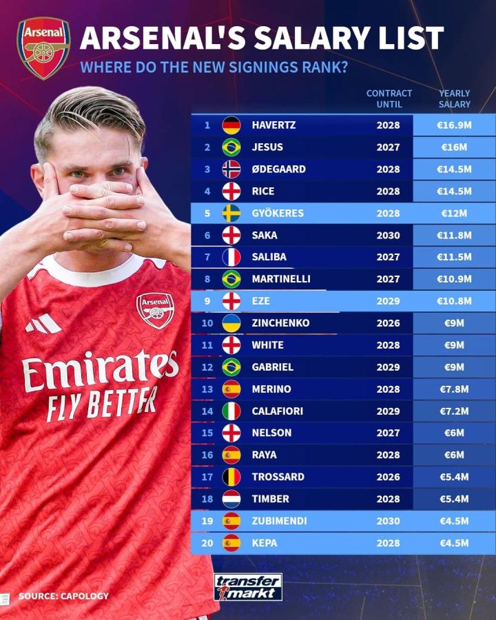 德转列阿森纳球员年薪排行:哈弗茨居首,哲凯、埃泽进前十