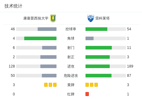 下半场补时第6分钟,雷科莱塔球队Alberto Hernández吃到第二张黄牌。