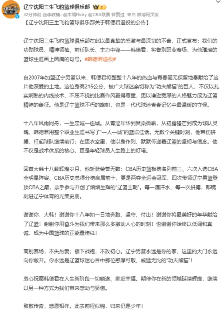 在今年5月初,辽宁男篮在CBA半决赛上被广厦男篮以3比0的总比分横扫出局,当时韩德君在赛后就开了直播,已经暗示自己可能选择就此退役。而在昨晚,辽宁男篮更新了球队的官方社媒账号,确认了韩德君将在今年夏天从职业赛场上退役。