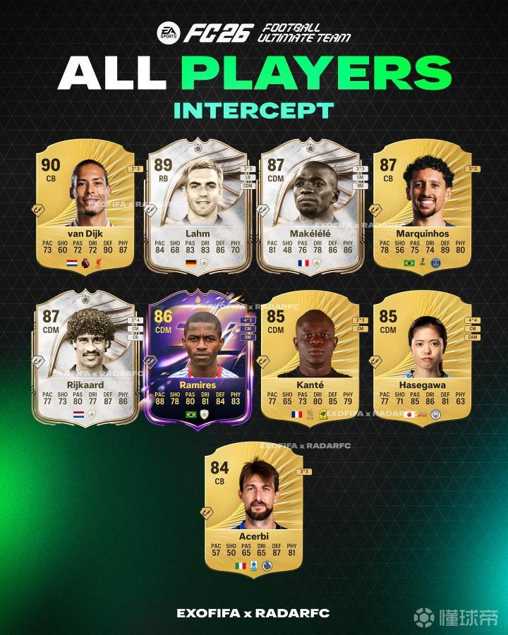 FC26金拦截球员:范戴克、马尔基尼奥斯、坎特、阿切尔比在列