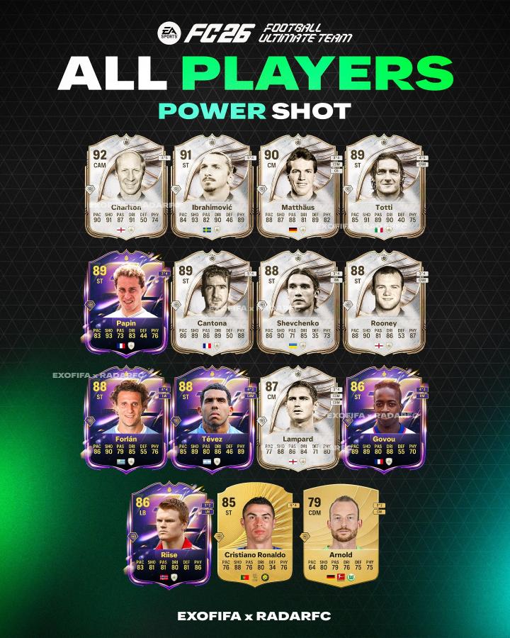 FC26金大力射门球员:伊布、C罗、鲁尼、兰帕德、托蒂在列