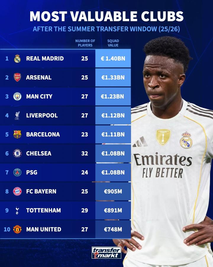 北京时间9月3日,德国转会市场发布2025/26赛季夏季转会窗口结束后最贵阵容榜单,皇马14亿欧元居首,阿森纳13.3亿欧位居次席,曼城12.3亿欧位列第三。