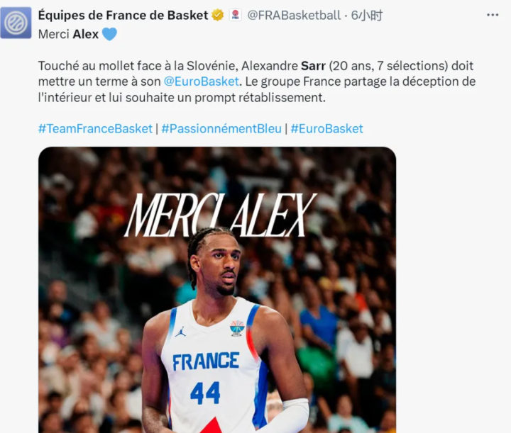 官宣受伤报销!NBA榜眼秀退出,法国男篮遇到困难