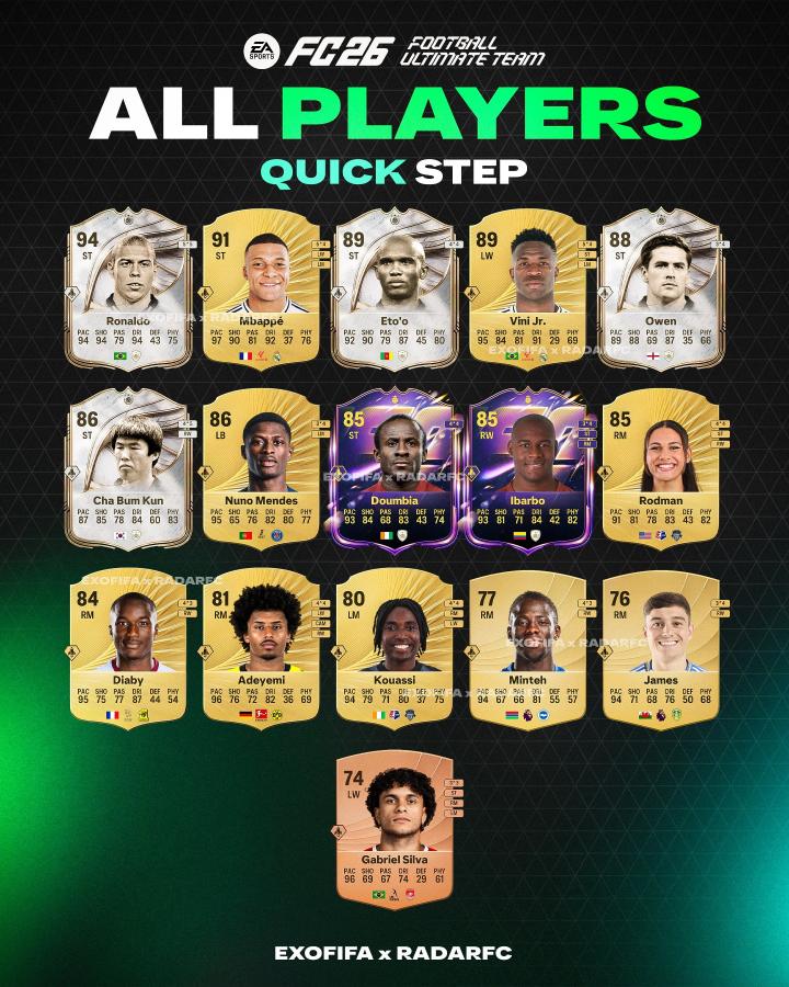 罗纳尔多、姆巴佩、埃托奥、维尼修斯、迈克尔-欧文、车范根、努诺-门德斯、敦比亚、伊瓦尔沃、罗德曼、迪亚比、阿德耶米、夸西、明特、丹尼尔-詹姆斯、加布里埃尔-席尔瓦