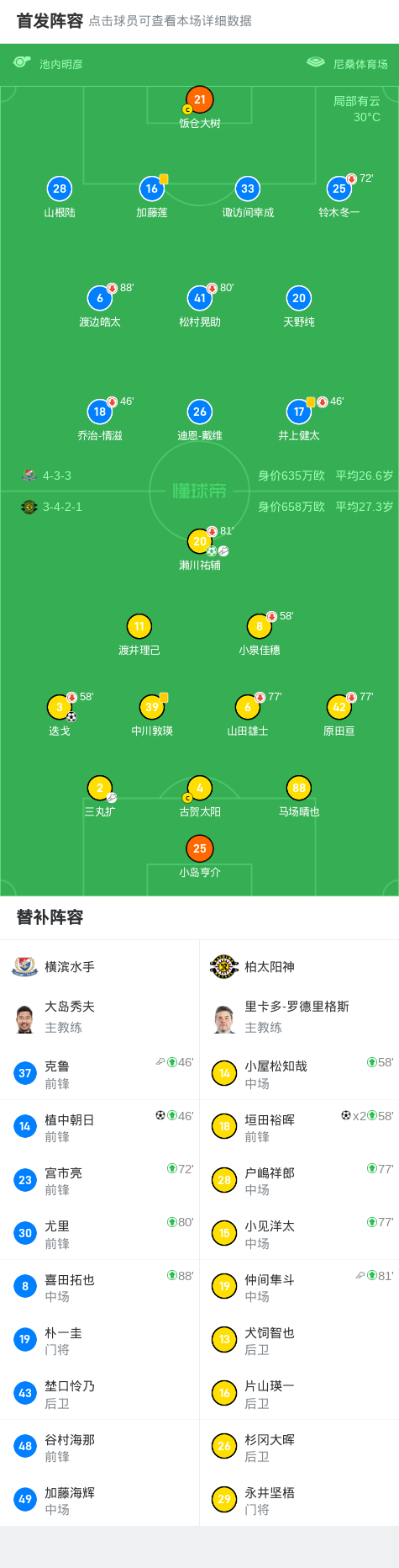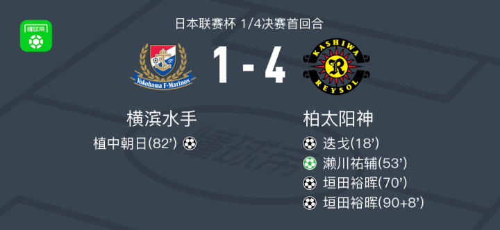 北京时间9月3日日本联赛杯 1/4决赛首回合,横滨水手对阵柏太阳神。横滨水手植中朝日破门。柏太阳神迭戈破门,垣田裕晖梅开二度,濑川祐辅破门。最终比分横滨水手 1-4 柏太阳神。