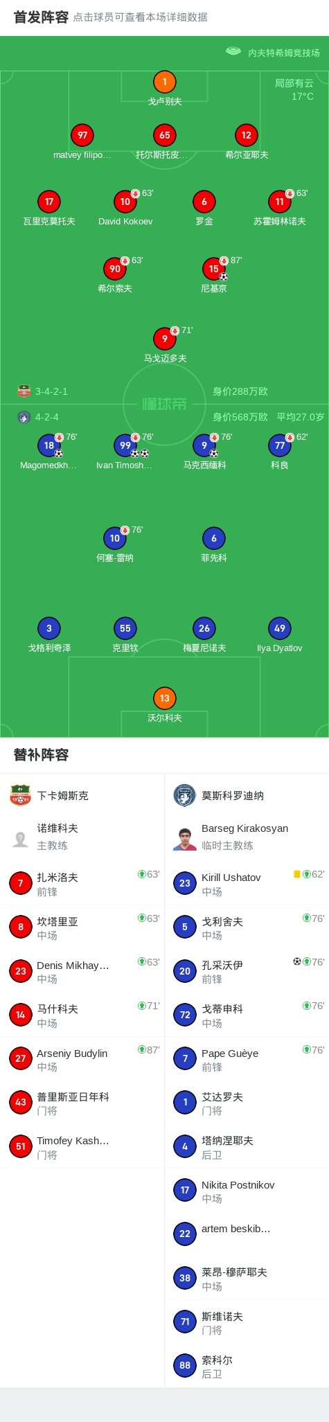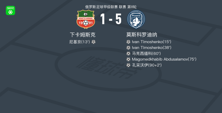 莫斯科罗迪纳5-1大胜下卡姆斯克,Ivan Timoshenko梅开二度,孔采沃伊建功