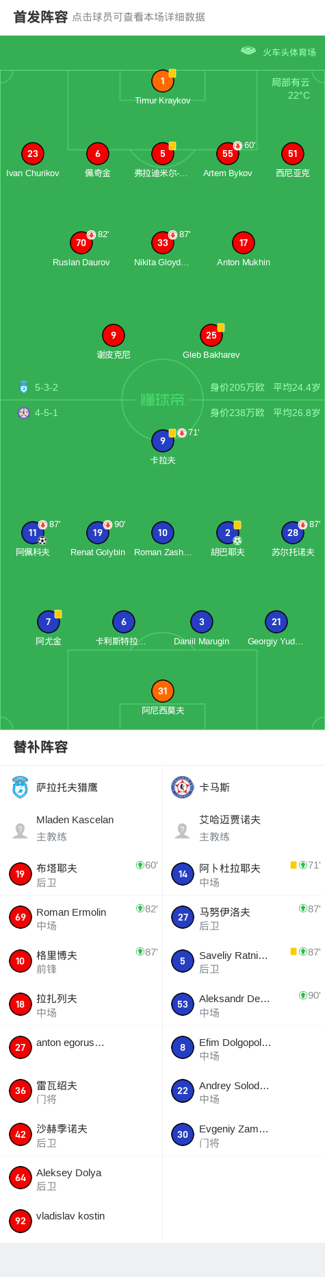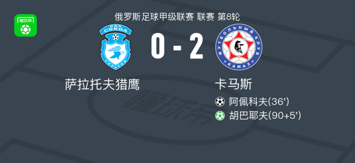 9月3日,俄罗斯足球甲级联赛第8轮,萨拉托夫猎鹰坐镇主场迎战卡马斯。比赛中,卡马斯球员阿佩科夫率先打破僵局,为其球队取得领先优势。随后,比赛进入下半场补时阶段,卡马斯球员胡巴耶夫冷静罚入点球,为球队锁定胜局。最终,萨拉托夫猎鹰0-2不敌卡马斯。