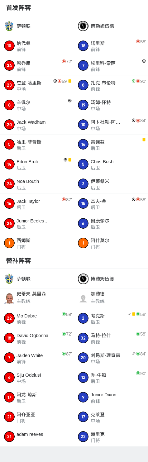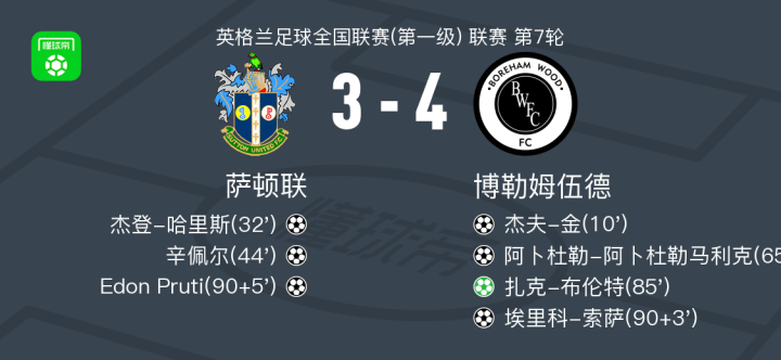 北京时间9月4日,英格兰足球全国联赛(第一级)第7轮,萨顿联坐镇主场迎战博勒姆伍德。比赛开始后,博勒姆伍德由埃里科-索萨送出助攻,杰夫-金率先破门。萨顿联随后由杰登-哈里斯扳平比分,紧接着杰登-哈里斯再次送出助攻,帮助辛佩尔反超比分。易边再战,考克斯助攻阿卜杜勒-阿卜杜勒马利克破门,为博勒姆伍德再度扳平。随后扎克-布伦特主罚点球命中,帮助博勒姆伍德取得领先。比赛进入补时阶段,刘易斯-理查森助攻埃里科-索萨再入一球,进一步扩大领先优势。终场前,萨顿联由Edon Pruti打入一球,但未能扭转局势。最终全场比赛结束,博勒姆伍德以4比3战胜萨顿联。