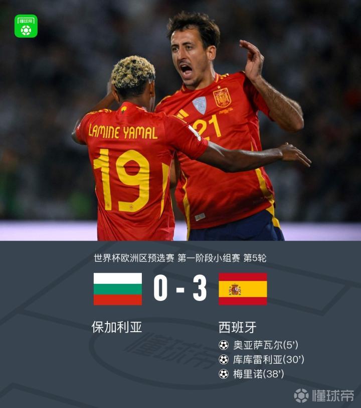 北京时间9月5日世界杯欧洲区预选赛 第一阶段小组赛 第5轮,上半场苏比门迪助攻奥亚萨瓦尔闪击,之后库库雷利亚禁区内劲射斩获国家队首球,随后亚马尔开出角球,梅里诺头球破门。最终西班牙3-0战胜保加利亚。