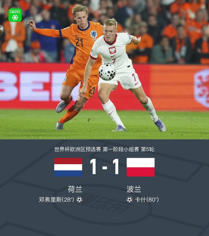 9月5日,世界杯欧洲区预选赛第一阶段小组赛第5轮,荷兰与波兰展开对决。上半场德佩开出角球,邓弗里斯后点头球破门。下半场卡什精彩爆射扳平。最终双方以1-1握手言和。