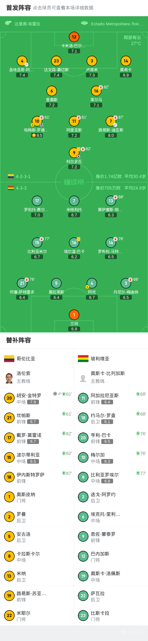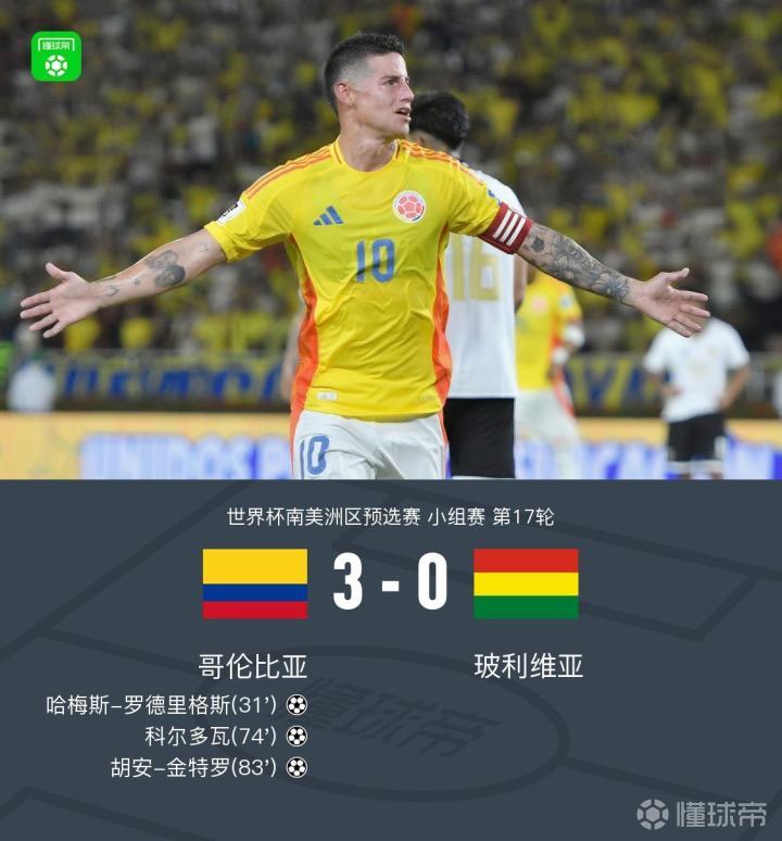 哥伦比亚3-0玻利维亚提前一轮晋级美加墨世界杯,J罗建功