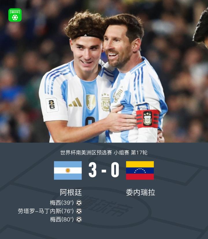 第80分钟,阿尔马达横敲,梅西门前推射破门,阿根廷3-0委内瑞拉