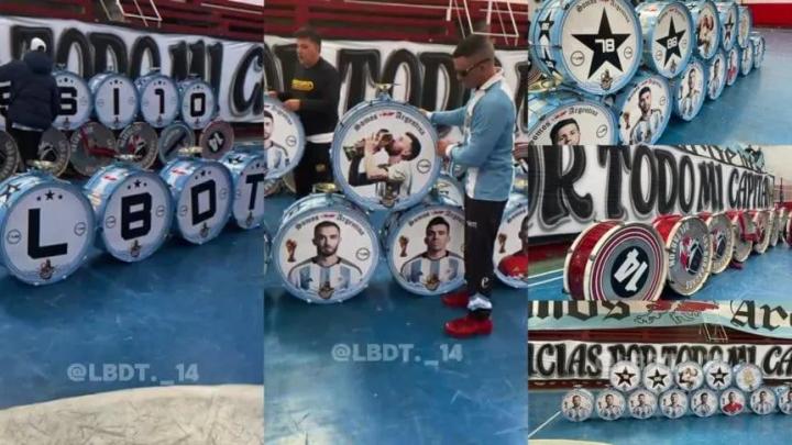 根据TyC拿到的图片,“Los Borrachos”定制了 30 面大鼓,其中26面绘有世界冠军球员的头像,并配有酒壶形状的标志,这是该组织的象征。这些鼓全部涂成蓝白相间,并印有醒目的“14”号。在背面,有的写着“Messi”,有的则是组织的缩写“LBDT”。