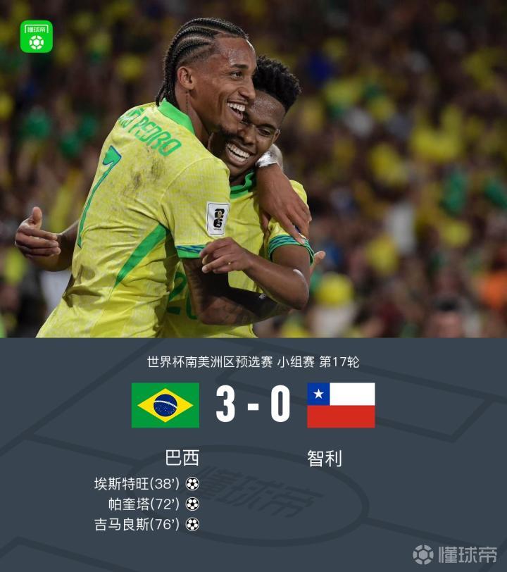 北京时间9月5日,世界杯南美洲区预选赛小组赛第17轮,巴西迎战智利的比赛如期举行。比赛中,巴西球员埃斯特旺在上半场完成破门,为球队首开纪录。随后,路易斯-恩里克送出助攻,帮助巴西球员帕奎塔扩大比分优势。比赛尾声阶段,又是路易斯-恩里克的打门被门将扑出后击中横梁,吉马良斯补射再下一城,将比分最终定格在3比0。全场比赛结束,巴西以3-0的比分完胜智利。
