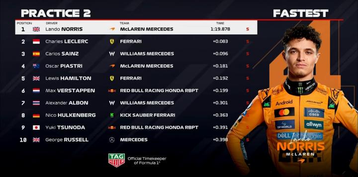 一练停表,诺里斯拿下全场最快,勒克莱尔在今天的2节练习赛中都排在第2位;
