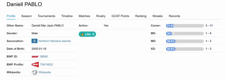 其中,上一场对阵澳大利亚U23时首发的主力中卫丹尼尔-巴勃罗平时也经常兼项打羽毛球,并且是一位在大洋洲羽协注册的运动员以及裁判员。通过国际羽联的官网可以看到,目前该球员在羽毛球赛事中的总战绩为3胜11负。