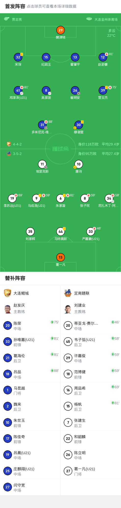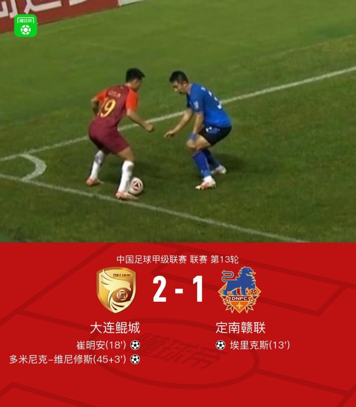北京时间9月6日中国足球甲级联赛 联赛 第13轮,大连鲲城主场对阵定南赣联。大连鲲城崔明安破门,多米尼克-维尼修斯破门。定南赣联埃里克斯破门。最终比分大连鲲城 2-1 定南赣联。