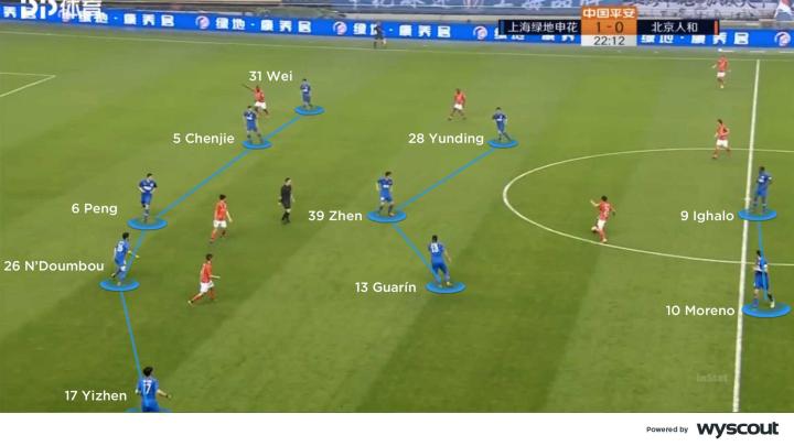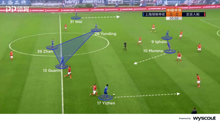 2019赛季的申花在首轮受挫后,拿出的三中卫体系在不断的变化中展现出了一些不同的元素。后腰客串的边中卫协助建立进攻,两个边路的高频率高强度往返,功能型极强的中场组合,最后形成了一个当前很多欧洲主帅喜爱的3-4-2-1阵型。