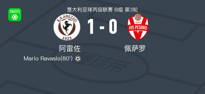 9月6日,意大利足球丙级联赛B组第3轮,阿雷佐坐镇主场迎战佩萨罗。比赛中,阿雷佐球员Mario Ravasio成功打入全场唯一进球,帮助球队以1比0的比分战胜对手,全取三分。