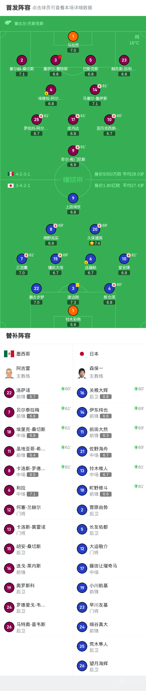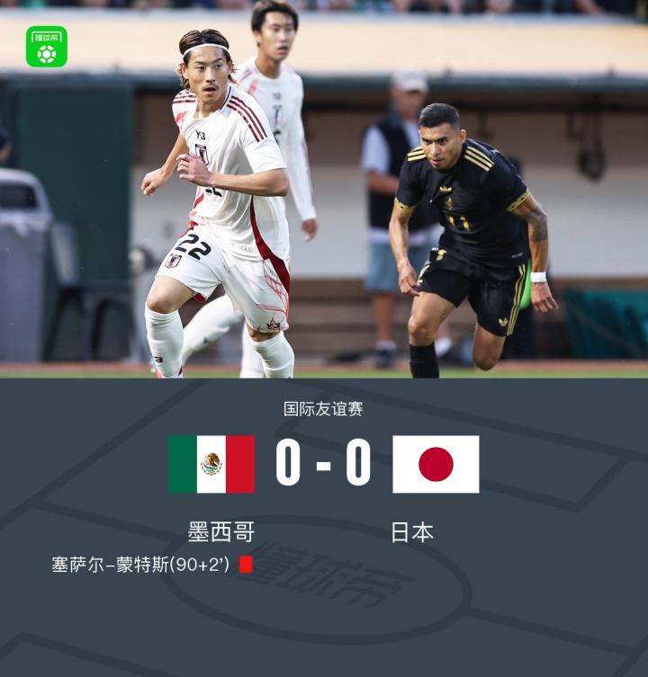 北京时间9月7日,国际友谊赛,墨西哥对阵日本。比赛中,板仓滉伤退,上田绮世造塞萨尔-蒙特斯直红。最终比分、墨西哥0-0日本。