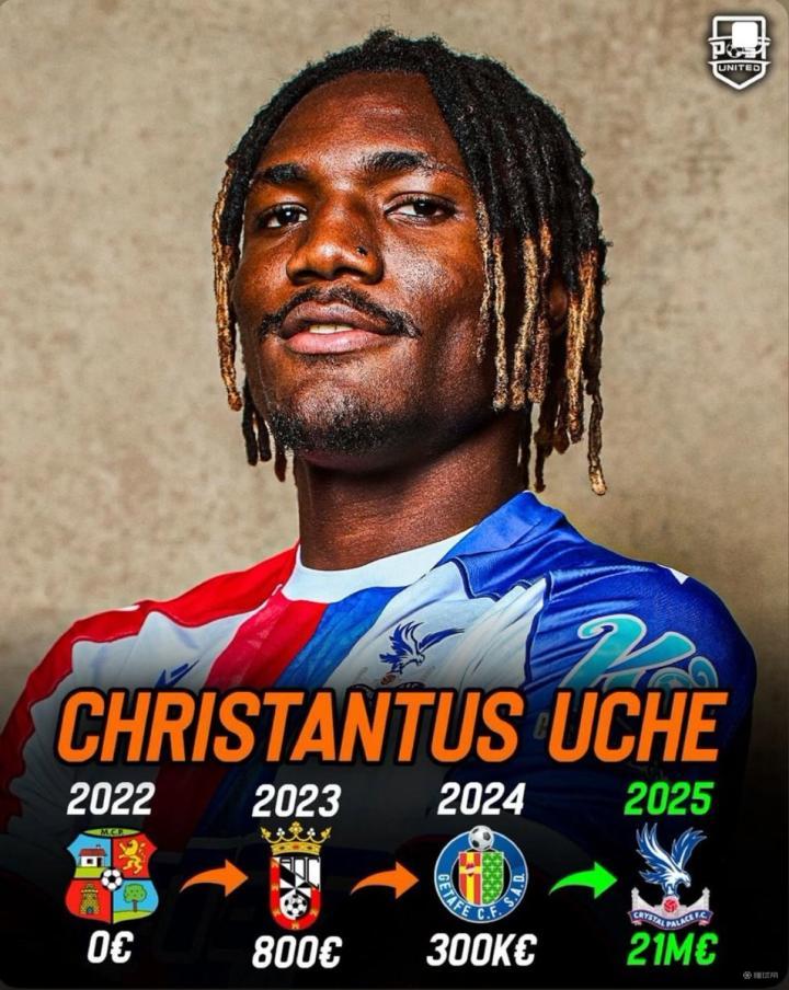 这位制造足坛罕见的爆炸升值的“藏品”,就是22岁的尼日利亚前锋,水晶宫的新援,赫塔费主帅博尔达拉斯的得意力作——克里桑图斯-乌切。今年夏窗最后时刻,水晶宫以租借+强制买断的方式从赫塔费签下了乌切,买断费用1750万欧。