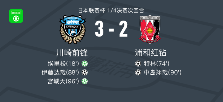 北京时间9月7日日本联赛杯 1/4决赛次回合,川崎前锋对阵浦和红钻。川崎前锋埃里松破门,宫城天破门,伊藤达哉破门。浦和红钻特林破门,中岛翔哉破门。最终比分川崎前锋 3-2 浦和红钻。两回合总比分川崎前锋4-3浦和红钻。