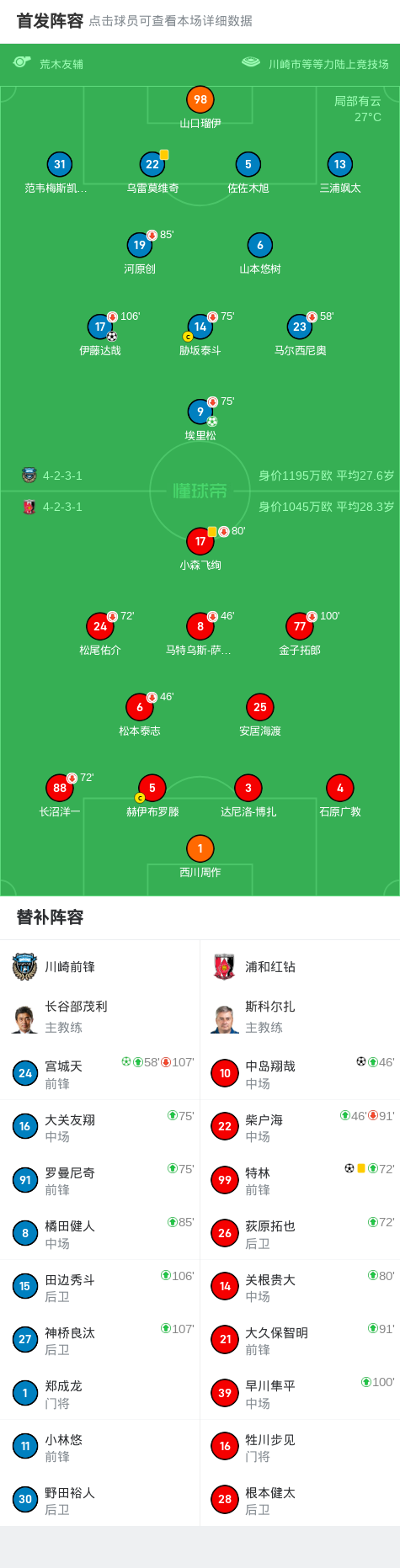 川崎前锋3-2浦和红钻,伊藤达哉建功,宫城天点射破门