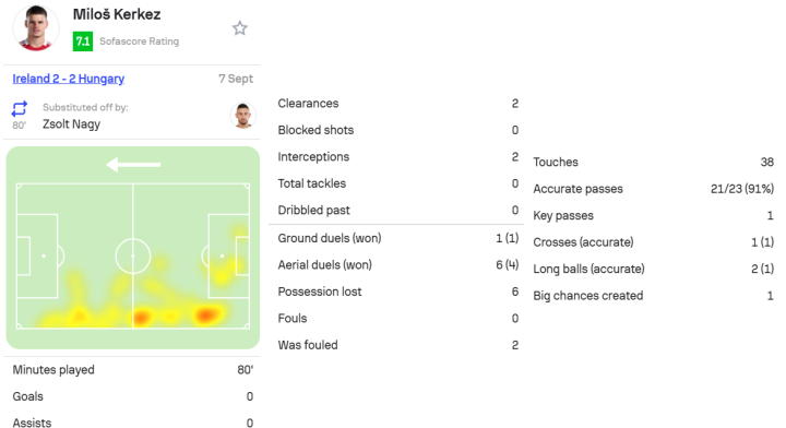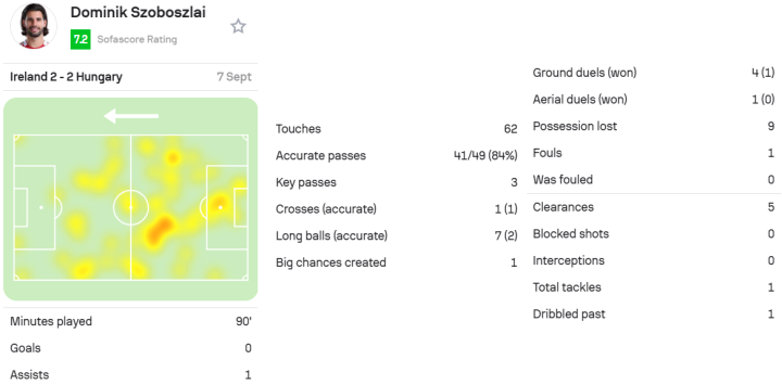 8.索博斯洛伊,爱尔兰2-2匈牙利,首发打满全场,助攻1次,黄牌1张。