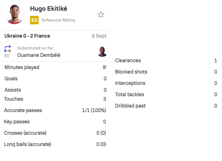 6.埃基蒂克,乌克兰0-2法国,第81分钟替补出场。