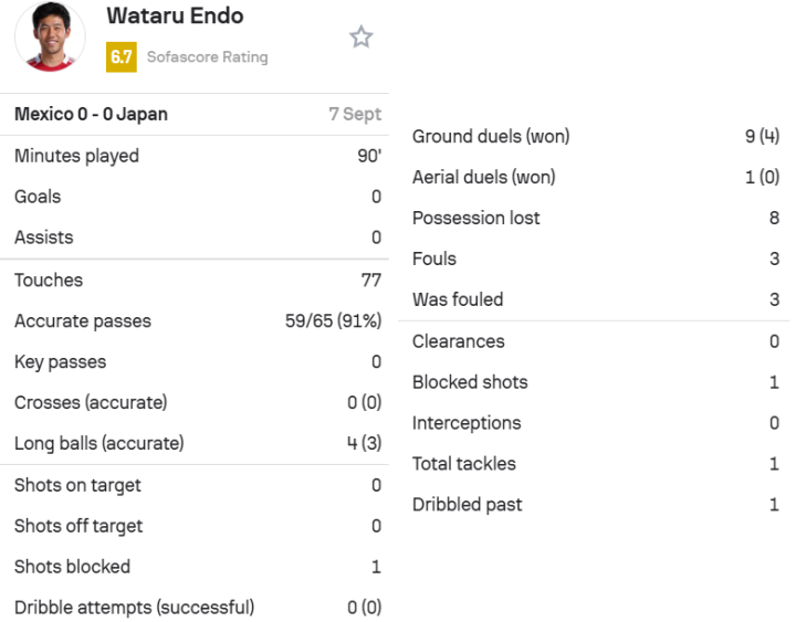 10.远藤航,墨西哥0-0日本,首发打满全场。