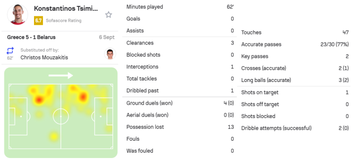 12.齐米卡斯(外租),希腊5-1白俄罗斯,首发出场62分钟。