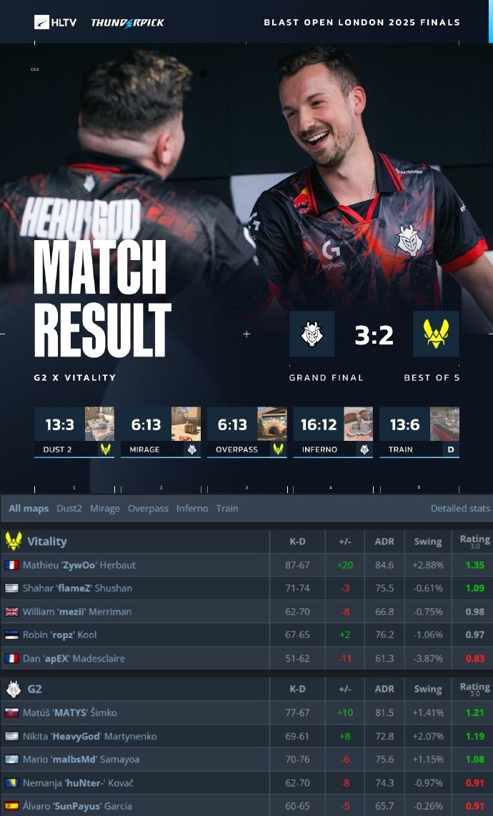 北京时间9月8日凌晨,G2苦战5图3-2击败Vitality夺得BLAST伦敦公开赛冠军,HeavyGod荣膺赛事MVP。